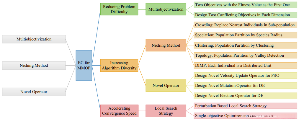 - 增加算法多样性 :大量的研究集中在增强种群多样性上,以帮助在MMOP中尽可能多地找到最优解。这些研究工作可分为小生境法(Niching Method)和新算子两大类。1)小生境法是将种群划分为若干子种群,使种群局部进化以保持多样性;2)为EC算法设计新的算子来适应MMOP问题。(但很少有研究关注个体的选择,如果选择算子设计不好,即使已经生成了不同最优区域的多样性解,也不能将它们选择到下一代中。)