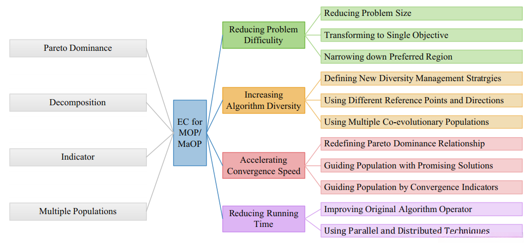 - 增加算法多样性 :由于MaOP问题的复杂性,许多研究都着重于增加解的多样性以帮助寻找全局最优PF。主要方法包括:1)定义新的多样性管理策略帮助EC算法生成分布均匀的多种解;2)随着搜索空间的扩大,一些方法倾向于使用不同的参考点和参考方向来增加算法的多样性。这些方法定义了不同的参考点和参考方向,保证了EC算法的基本多样性;3)另一种提高算法多样性的方法是使用多个协同进化种群,因为不同的种群可以配置不同的设置,或者它们可以合作搜索不同的区域。