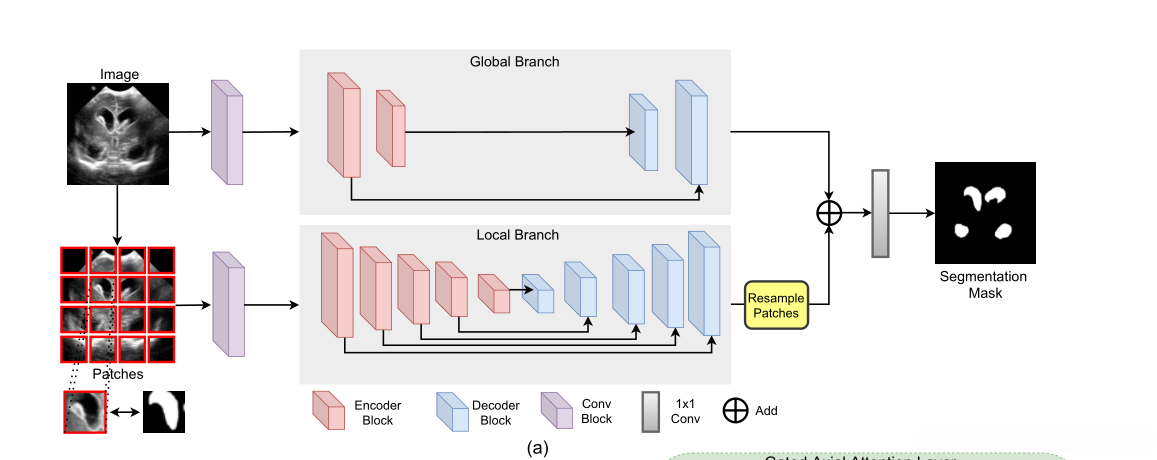 然后将两个分支的输出特征图相加并通过1×1卷积层以产生输出分割掩码.全局分支关注的是高层信息,而局部分支关注的是更精细的细节。