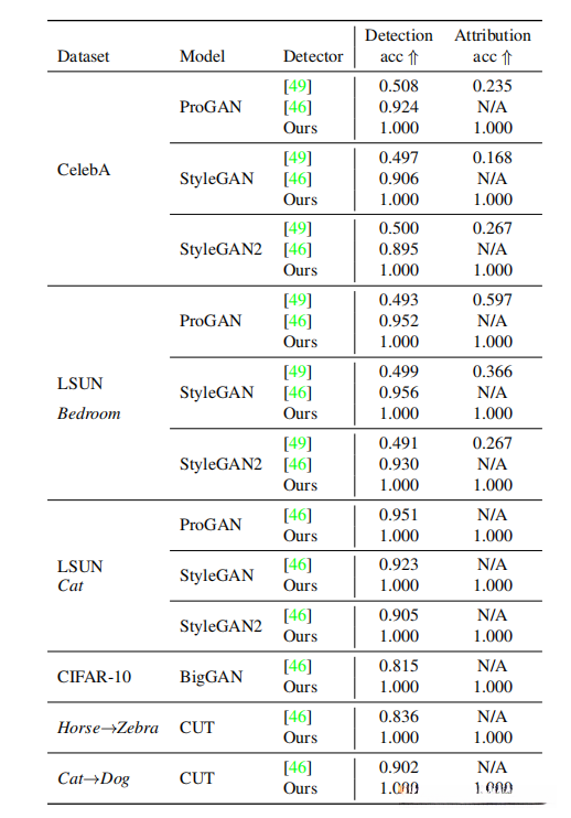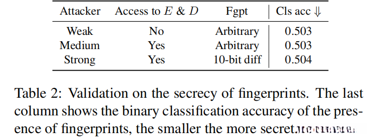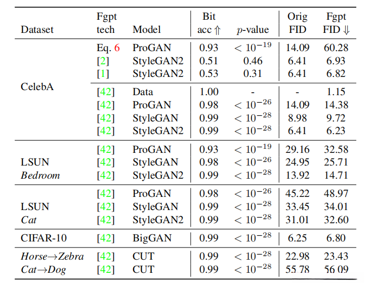 并非仅在训练数据中嵌入指纹这一做法不再适用。相反,在本研究中我们采用了集成生成过程与模型训练步骤的方式进行改进。具体而言,在干净的数据集上进行模型参数优化,并确保生成图像不仅具有与真实数据相似的特点, 还能够携带特定指紋信息以实现高定位标准的要求。“Orig FID”值对应于无指印的原始模型性能, 其余几行则展示了基于不同指紋识别策略的表现情况。”