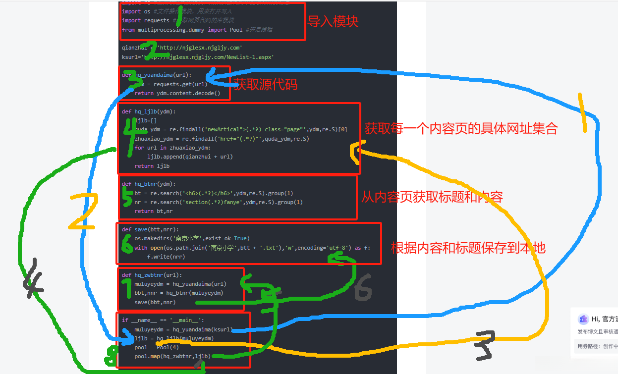 这个函数开始调用之前的那几个函数了,第二行开始,把网址是url的提取出来源代码给muluyedm,第三行,然后调用第五部分代码的函数,从源代码中提取出来标题和内容,第四行,调用第六部分的函数将第三行获取到的值,赋值到第六部分的函数,保存到本地。