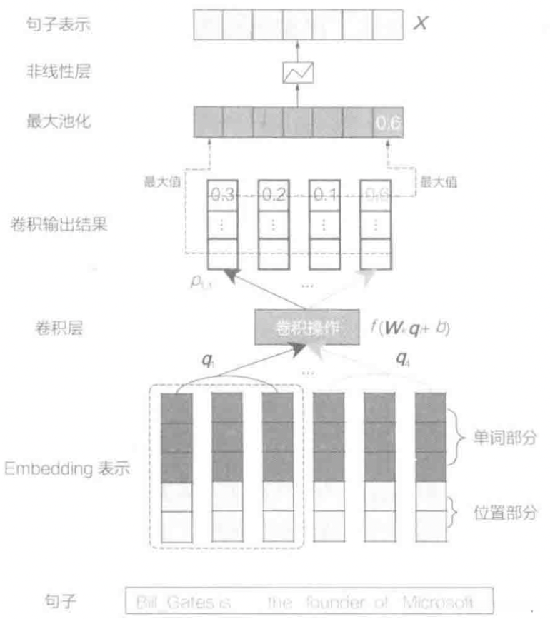 其中,f 为激活函数。对所有的窗口进行计算,第 k 个卷积核输出的结果为 \boldsymbol{p}_k=[p_{k,1},\cdots,p_{k,m-l+1}]^\top \in \mathbb{R}^{m-l+1}。对所有卷积核的输出结果分别做最大池化操作 p_{k,\max}=\max(\boldsymbol{p}_k),并将输出结果拼接起来,经过非线性变换,得到句子的表示为 \boldsymbol{x} \in \mathbb{R}^{d_c}。给定实体对的句子,预测实体对的关系的概率可以建模为: