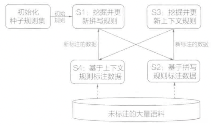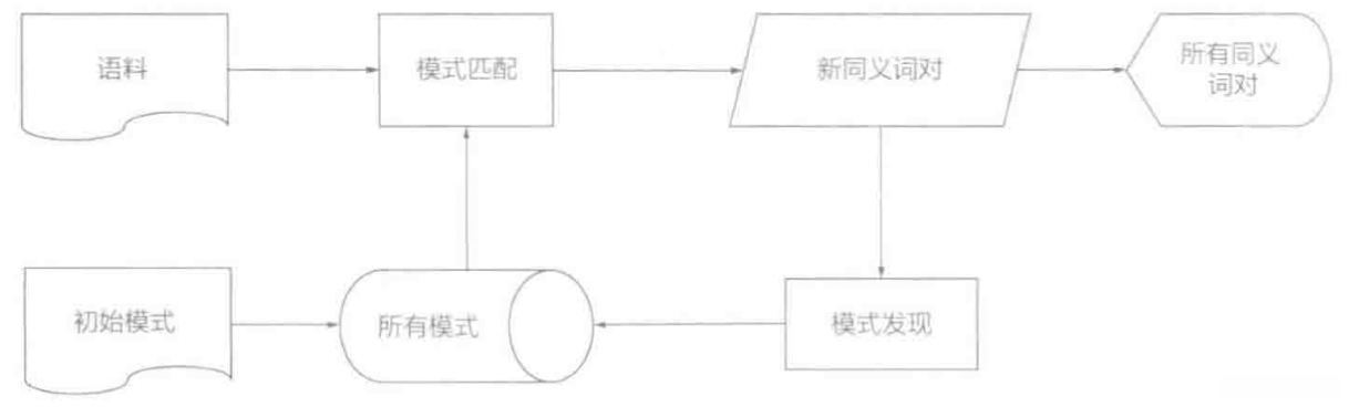 该方法(Bootstrapping)是对基于模式匹配的技术的一种改进方案,在少量初始样本或预设模板的基础上通过不断从语料中学习同义词在文本中的新表达方式来显著提升信息检索的召回率。该方法作为一种循环迭代的学习机制,在每轮循环中识别新的模式结构并更新相应的同义词映射关系;持续更新直至满足特定终止条件。