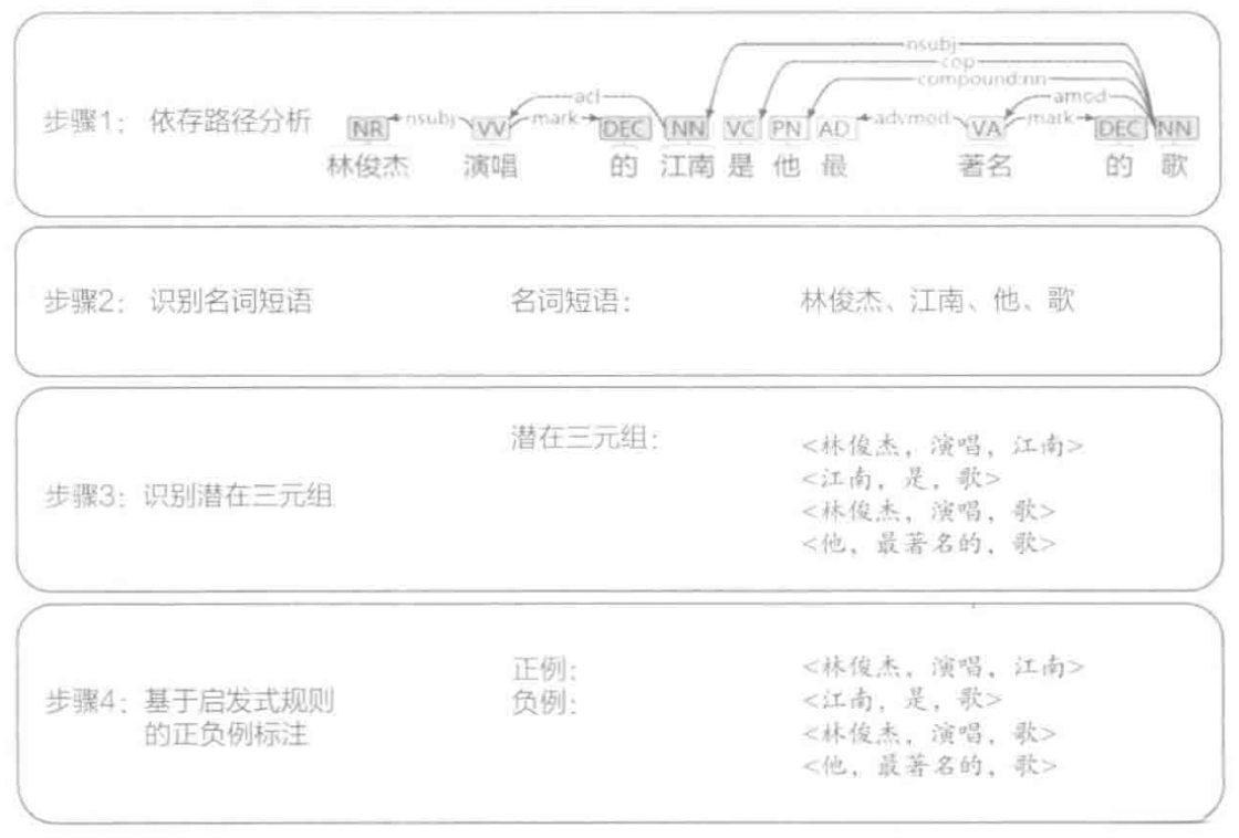 第4步:遵循启发式规则进行正反例标注。例如,在命名实体识别过程中, 单一的代词不宜充当实体角色, 实体之间的依存关系不宜过于冗长, 实体间的关系不应跨越子句结构等