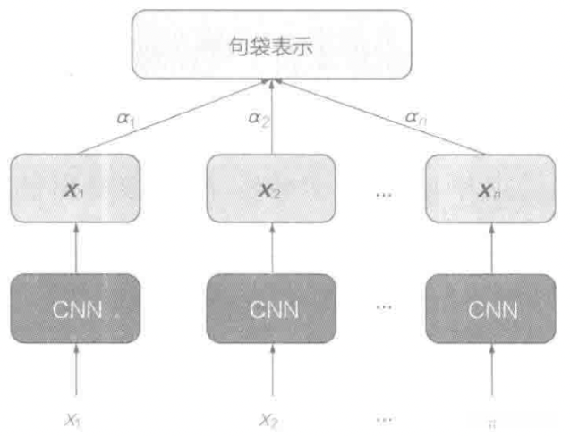 基于远程监督学习构建的数据集中存在较高的噪声水平。因此必须采取特别措施来去除或减少这些噪声。基于句子级别的注意力机制(Attention)的抽取方法的核心理念在于:给每个实体对分配一个权重值,并根据其与目标关系的相关程度进行调整。其中权重数值越大则表明该句子在描述目标关系方面的作用越显著;而数值较小则可能属于冗余或无关的信息。具体而言,在这种模型架构中(如图所示),通过多层感知机来建模实体间的关系强度并完成最终的关系抽取任务