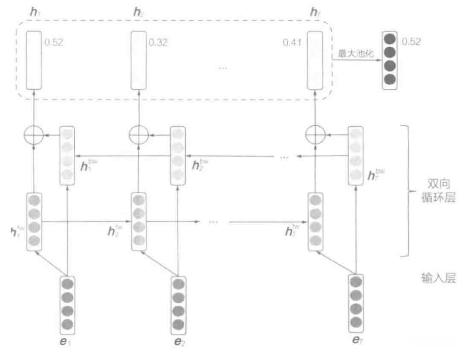 (2)双向循环层。对句子中的每个单词生成其对应的向量表示,并通过一个双向递归神经网络模型来处理整个句子以捕捉语义信息。对于每个时间步t而言,在前馈方向上(FW),我们计算当前时刻t上各节点的状态;而在反馈方向上(BW),我们同样计算当前时刻t上各节点的状态。随后我们将前馈方向和反馈方向的结果相加得到最终状态h_t = h_t^{FW} + h_t^{BW}。其中h_t^{FW}代表前馈方向上的状态h_t^{BW}代表反馈方向上的状态;这里的符号定义与之前一致;通过这种方式我们可以有效地捕捉到词语在其前后位置的不同语义信息并将其整合起来