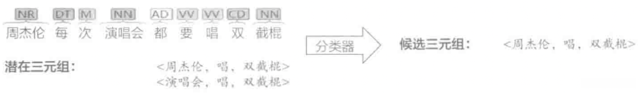 首先采用较为轻量化的语法分析手段,在文本中识别出与主语和宾语相关联的名词短语,并将出现在两个名词短语之间的其他短语作为候选关系进行考察。在此基础上利用上一模块训练所得的分类器对这些三元组进行初步筛选,在此基础上得到大量候选三元组。