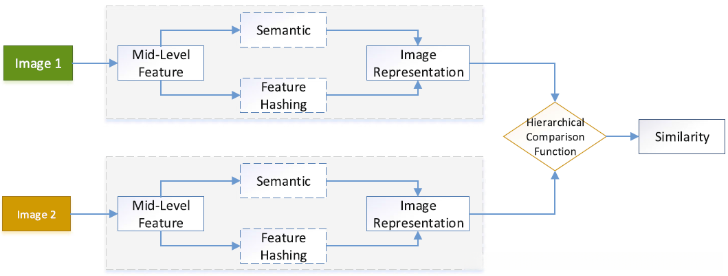 从逻辑上来说,学习图像表示主要分为两个部分,包括匹配语义标签的概率性评价和匹配特征的哈希函数,然后通过分层策略进行融合。