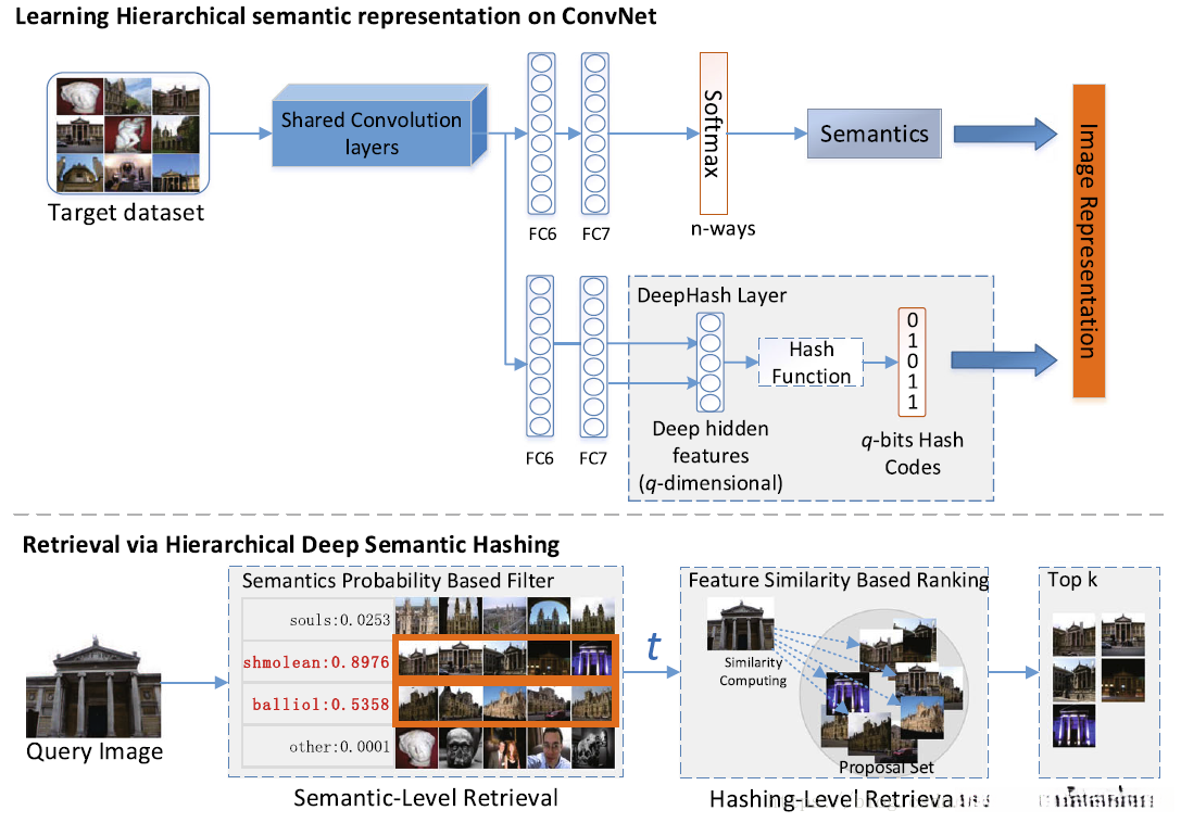 整个架构的第二部分为通过分层深度语义哈希进行检索。Sim(a,b)是一个joint algorithm,因此计算所有图像的相似性时间复杂度太大,因此在检索过程中我们采用一种分层策略。如上图下部分所示。通过语义层相似性才丢弃一些图像,然后得到m张图像的候选集合: