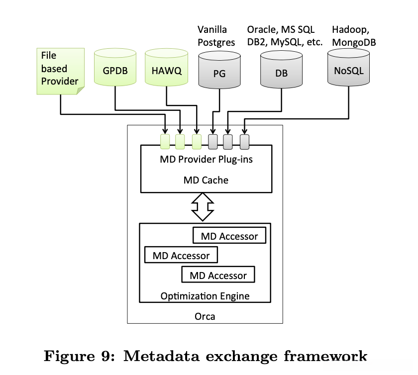 Orca被特意设计为不直接与数据库系统进行交互,默认情况下它专注于执行外部操作. 元数据交换成为优化器与数据库系统之间的主要交互机制. 例如,在设计查询计划时, 优化器需要了解每个表格是否具备索引. 元数据通过一组特定的元数据提供者(metadata providers)访问, 这些提供者都是系统定制化的插件模块, 可以从预定义的存储位置中提取这些信息.