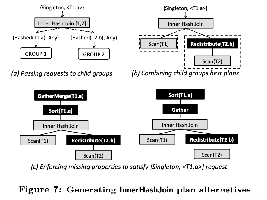Figure 7详细描述了针对请求req. #1中InnerHashJoin[1,2]所实施的优化方案。该方法的核心在于根据 join conditions 对 child distribution 进行精确配准,从而确保参与 join 的元组位于同一位置(co-located)。这一配准过程具体体现在两个子组别中:group1要求所有元组需满足 Hashed(T1.a),而 group2则要求所有元组需满足 Hashed(T2.b)。需要注意的是,这两个子组别都必须满足 Any sort order 的条件才能完成 join 操作。在确定最优 child plan 后,InnerHashJoin将整合 child properties 来决定最终的 distribution 和 sort order 策略。特别地,group2的最佳计划要求对 T2 按照 T2.b 进行 hash 分布;然而,由于 T2 的原始数据本应按照 T2.a 进行 hash 分布(而 group1的最佳计划则采用了简单的扫描方式),因此这一策略得以实施的原因也得到了合理解释