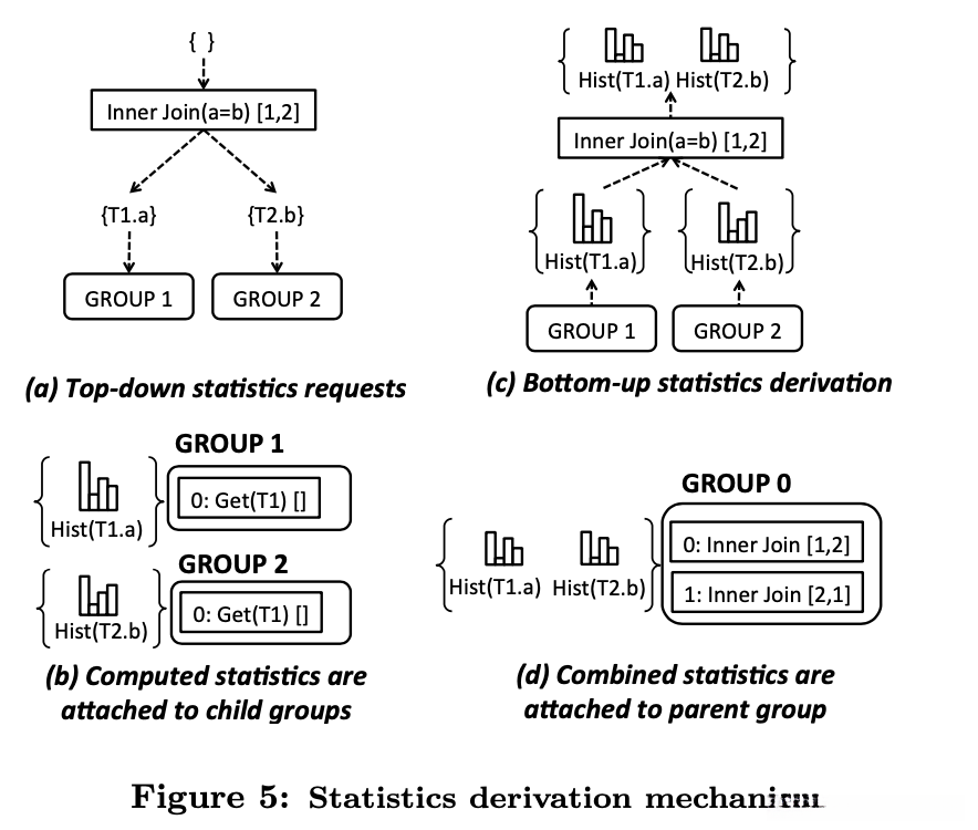 在目标group中选择最具潜力的group expression后, Orca会依次触发所选group expression的所有child group上的统计信息推导.随后, 通过整合child group的所有统计信息来构建目标group的统计实体.