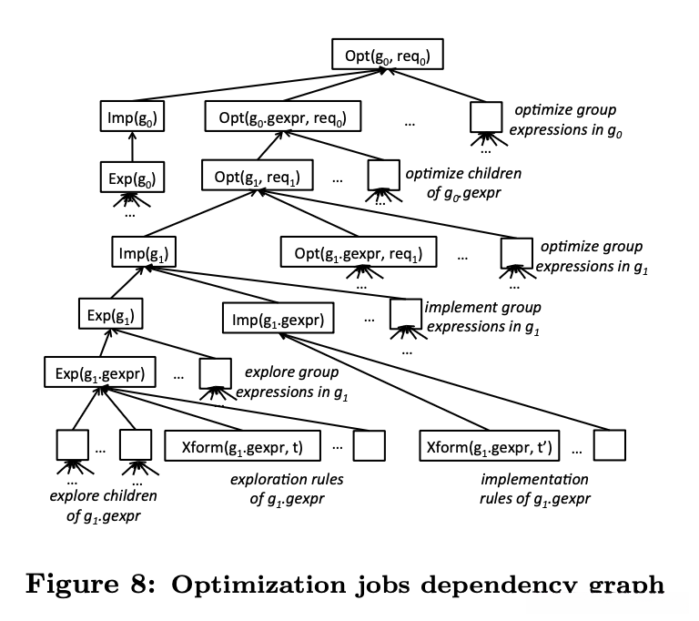 (4) Optimization:在这一阶段中, properties将被强制执行,并用于计算可选计划的成本.优化过程通过发起一个初始的优化请求至Memo的根组启动,并指定了必要的要求,例如结果分布或排序.随后,将请求r提交至group g,以指示root物理操作器应返回满足r所需的最低成本计划.