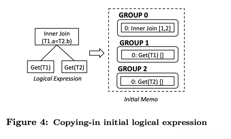 (3) Implementation:在处理逻辑表达式时, 能够为逻辑表达式生成物理表达式的转换规则会被触发. 例如, Get2Scan规则会将逻辑上的Get转换为物理上的表扫描操作. 类似地, 内联连接操作分别采用哈希连接和逐层循环实现方法.