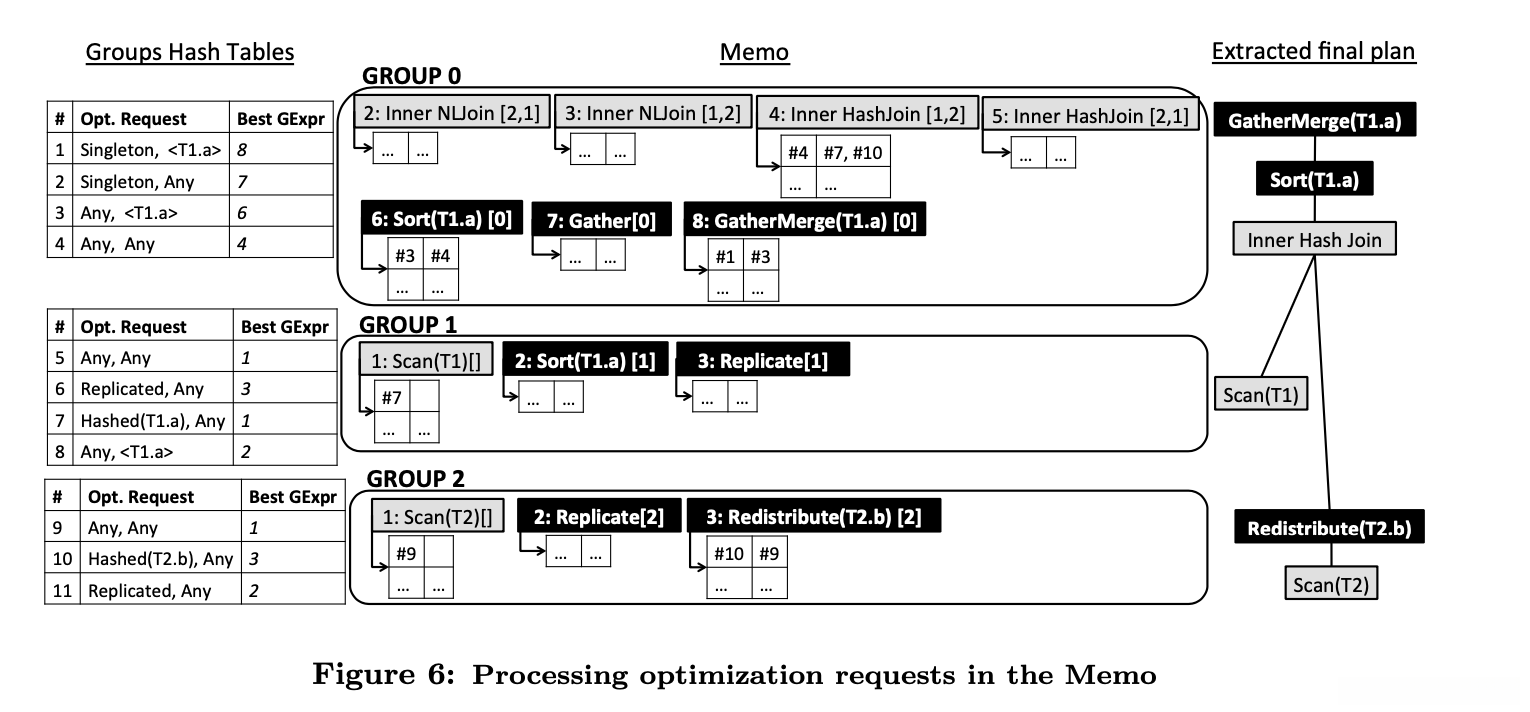 Figure 6展示了Memo中运行的优化请求示例。初始的优化request是 req. #1: {Singleton, <T1.a>},它指定了query result需要按照T1.a有序聚集在master上。我们同样展示了group hash table ,其中每个request都与满足要求的最少估计成本的最佳group expression(GExpr)相关联。黑色的各自标明了enforcer operators ,它们是被插入到Memo中的,用于传递order和data distribution。Gather operator 将元组从所有的segments收集到master上。GatherMerge operator 将有序的数据从所有的segments收集到master。Redistribute operator 基于给定参数的hash value将元组在segments中分发。