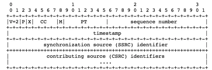 上图开头部分包含前 96-bit 的数据, 每个 RTP 包都会包含此部分数据. 其中 CSRC 部分仅限于 Mixer 发送的报文中存在. 各字段的意义如下: