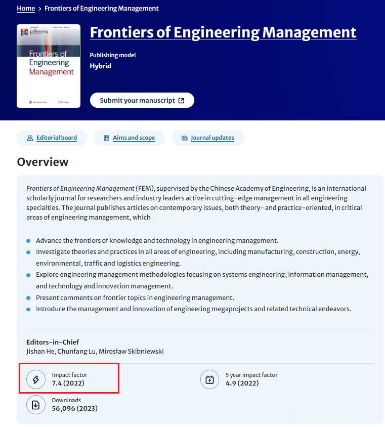 由中国工程院监督的《工程管理前沿》(Frontiers of Engineering Management,简称FEM)是一本国际学术期刊,面向活跃于所有工程专业前沿管理的研究人员和行业领导者。该杂志在工程管理的关键领域发表关于当代问题的文章,包括理论和实践导向,其中