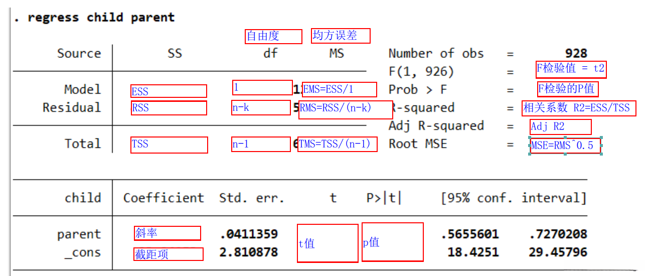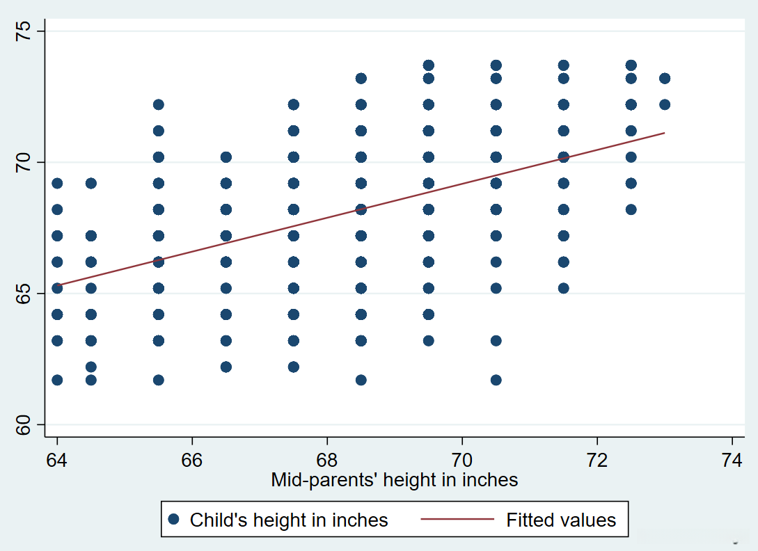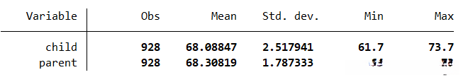 该研究型数据集galton.dia包含了高尔顿(1886)的研究原始数据。该指标parenl表示父母平均身高(以英寸计算),而child表示子女身高(以英寸计算)。其中,在消除性别间身高差异的基础上,默认将女性身高数据(包括母亲和女儿)乘以1.08。