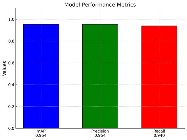 模型的性能指标 mAP 、Precision 和 Recall ,分别用蓝色、绿色和红色表示。所有指标都达到了较高水平,显示出模型的综合性能非常优秀。