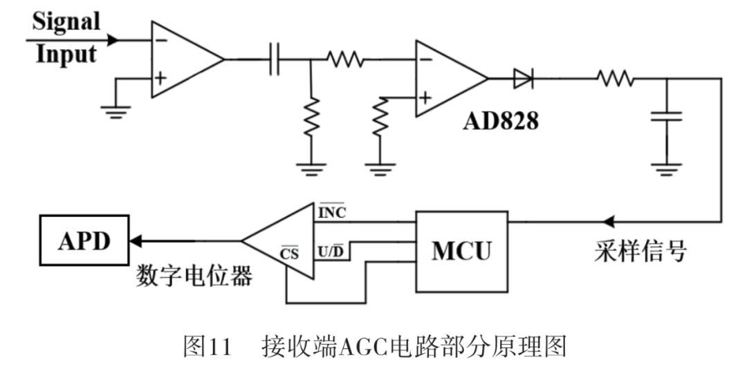 为了适应通信距离变化引起的信号幅度波动,本文设计了一种闭环负反馈自动增益控制(AGC, Automatic Gain Control)系统,即前端放大电路的增益随信号强度自动调整,以达到稳定信号幅度的目的。图11 为AGC电路部分实现原理,压控放大器与滤波器采集接收信号幅度,由MCU反馈至电源,通过动态调节APD的供电电压来达到自适应的目的,从而在接收端形成控制闭环。