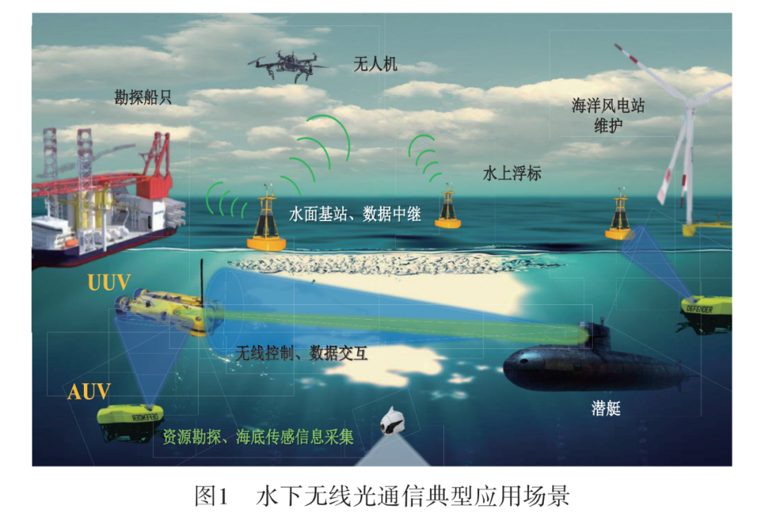 近年来,人们大规模开发海洋资源,为了完成更严峻、更精准的水下作业,对作业的通信需求越来越高,如图1所示 ,对于如水下焊接、海洋风电设备维护、无缆水下机器人(AUV, Autonomous Underwater Vehicle)等深海装备高速信息传输的场景需求如何实现通信,这对现如今主流的水下通信技术是极大的考验。