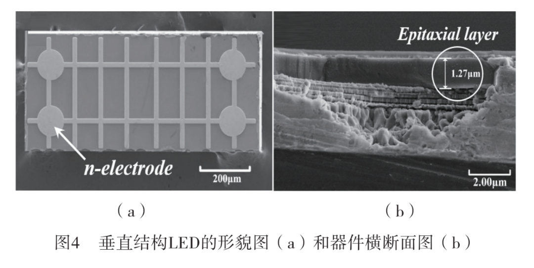 基于硅衬底氮化镓晶圆,笔者制备了垂直结构蓝光LED器件。如图4(a)所示 ,器件长为990 μm、宽为430 μm;LED器件的横断面扫描电子显微镜图如图4(b)所示 ,器件的厚度约为1.27 μm。