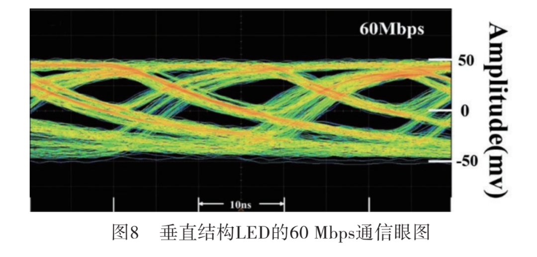 本文采用垂直结构LED器件建立了光通信系统。系统发射端由Keysight 333600A任意波形发生器以1 V的峰值电压和3 V的偏置电压驱动器件将伪随机二进制序列(PRBS, Pseudo-Random Binary Sequence)信号编码为光信号。另一端,采用Hamamatsu C12702-11探测器将光信号转换成电信号,发送到Keysight DSOS604A数字存储示波器。图8 为数据通信速率为60 Mbps时的眼图,眼宽即“眼睛”空白部分在横轴的长度约为10 ns,说明信号总体较稳定但伴随一定的时域抖动。器件在高频的最佳抽样时刻为“眼睛”睁开最大的时刻,系统应用可以选取幅度达到最大幅度的80%以上或最小幅度时间内进行电平信息采样。