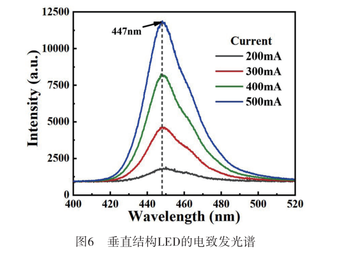 使用Keithley 2636B数字源表作为直流电源为LED提供恒定电流驱动,采用直径200 μm的多模光纤收集LED发射光,通过USB4000海洋光谱分析仪进行表征。如图6所示 ,器件发光光谱的主峰在447 nm,发光强度随注入电流增加而增强。通过改变注入电流调控LED器件的发光强度,从而实现信号的光加载。