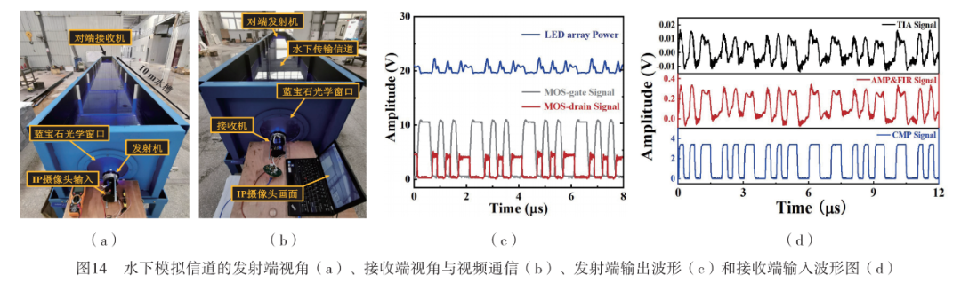 为了方便测试,本文将收发端系统各置于衰减系数为0.4 dB/m的10 m水槽窗口两端,如图14(a)和(b)所示 ,双方接收端均配有D25mm,OD=0.6,透过率25%与OD=1.0,透过率10%共计40倍衰减的光学衰减片,来模拟纯净海水50 m@0.4 dB/m的通信信道。收发两端分别连接电脑与基于TCP协议的网络摄像头进行视频传输,用RIGOL DS1102Z数字存储示波器采集系统发射端LED阵列、MOS管栅极与漏极波形,以及接收端跨阻放大器、高通滤波器与比较器输出波形。图14(c)和(d) 分别为系统发射端与接收端的2 MHz调制信号波形图,其中灰色曲线为控制信号即MOS管栅极调制波形,峰值Vpp约为11 V。灯珠阵列电源与MOS管漏极形成的幅度差值控制LED发光强度的变化,从而发出连续的调制光信号。接收端达到了对微弱信号约50 K倍的转换增益,后级设置的滤波电路对外界环境光、前级电路引入的噪声进行了有效滤除,自动增益控制功能避免了信号出现削顶、削底失真,模数转换输出波形规整、无误判现象,测试结果表明,本文提出的基于亚波长垂直结构蓝光LED的UOWC系统实现了水下50 m通信距离不低于2 Mbps的通信速率,并支持音视频、多路传感数据等业务的实时高速传输。