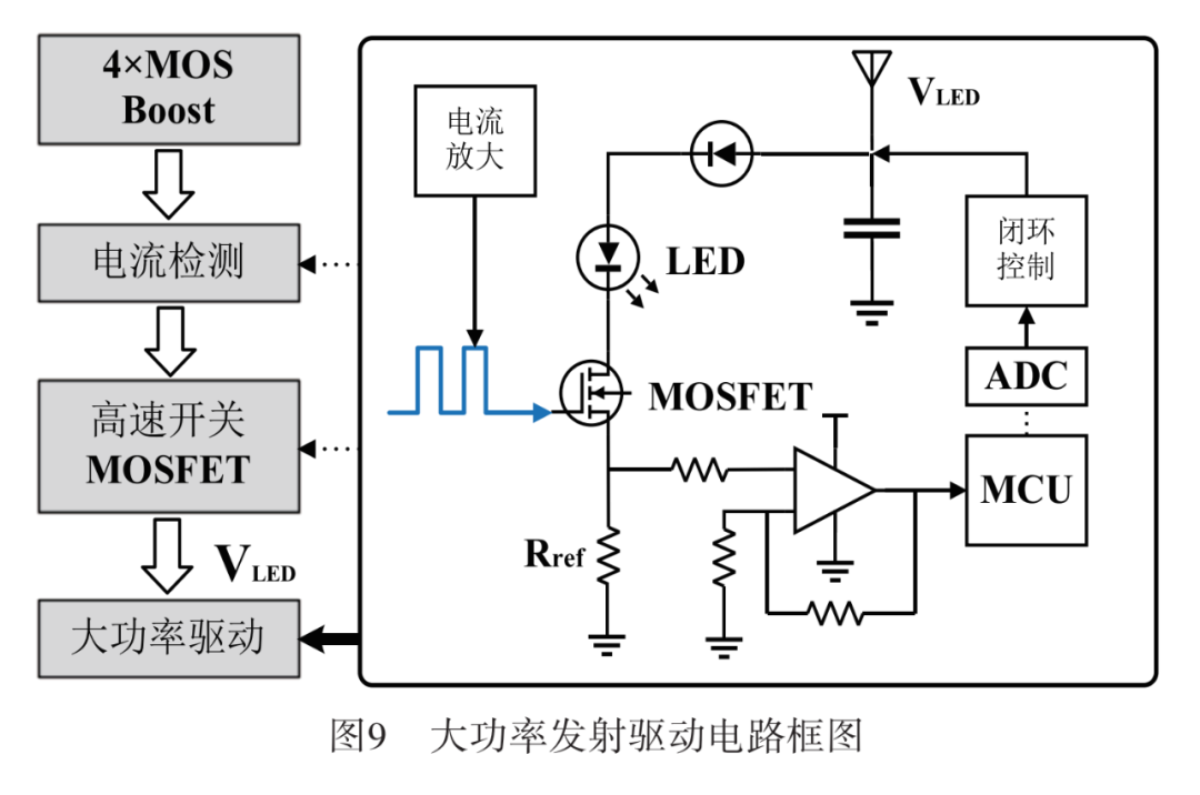 信号驱动电路的输入为双极性信号,采用前级功率放大电路对信号源进行放大,提高信号负载能力。MOSFET驱动电路利用信号控制栅极实现对LED阵列的调制。发射端驱动电源采用4MOS稳压保护电路,单片机(MCU, Microcontroller Unit)通过对源极精密电阻Rref进行电压采样,求取流经LED的电流平均值并与设定的电流容限比较,再输出控制信号反馈至电源芯片来保证LED阵列长时间的恒压恒流供电。
