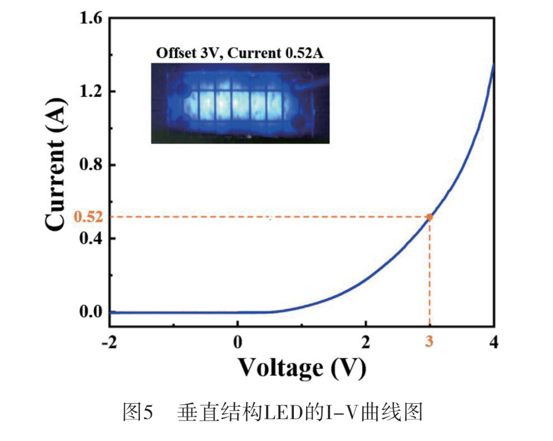器件的I-V特性采用Keithley 2636B数字源表进行表征。如图5所示 ,当注入电流为0.52 A时测得的电压为3 V,可从线性区域的I-V曲线斜率中提取出5.77 Ω的动态电阻。其中,插图为器件注入电流0.52 A时的发光图。