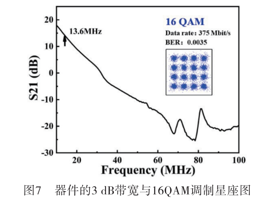 本文采用T型偏置器为LED提供信号与直流偏置,测试其3 dB带宽。信号由Agilent Technologies PNA-LN5203C网络分析仪经由放大器与衰减器发出,与PIN型光电二极管、放大器、衰减器流向网络分析仪构成的接收回路。如图7所示 ,本文器件的3 dB带宽为13.6 MHz,此时信号幅度下降为峰值的0.707倍。其中,插图展示了器件在最佳工作点时采用16QAM调制误码率千分之三的星座图,最高通信速率为375 Mbit/s。