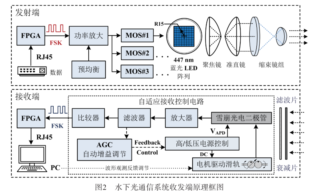 **【摘 要】**发光二极管作为光发射器件,是水下光通信传得远、传得快的核心器件。为了满足水下高速光通信的实际应用需求,设计了一种基于亚波长垂直结构LED器件的水下蓝光通信系统。根据亚波长理想LED模型,研制高出光效率、高调制速率的垂直结构蓝光LED,基于该器件围绕大功率发射驱动、高灵敏度自适应探测与数字编码调制技术,提出了面向6G网络的水下光通信系统。实验结果表明,在光传输损耗不大于0.4 dB/m的情况下,所提出的光通信系统实现了传输距离不低于50 m、通信速率2 Mbps的全双工通信。