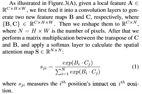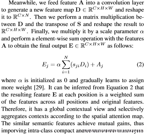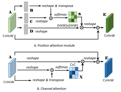 - 我们在扩展的FCN上附加了两个并行注意模块。一个是位置注意模块,另一个是通道注意模块。对于位置注意模块,我们引入了自注意机制来捕获特征图任意两个位置之间的空间相关性。对于某个位置的特征,通过对所有位置的特征进行加权求和来更新,其中权重由相应两个位置之间的特征相似性决定。也就是说,任何两个具有相似特征的位置,无论它们在空间维度上的距离如何,都可以相互促进。对于通道注意模块,我们使用类似的自我注意机制捕获任意两个通道映射之间的通道依赖关系,并使用所有通道映射的加权和更新每个通道映射。