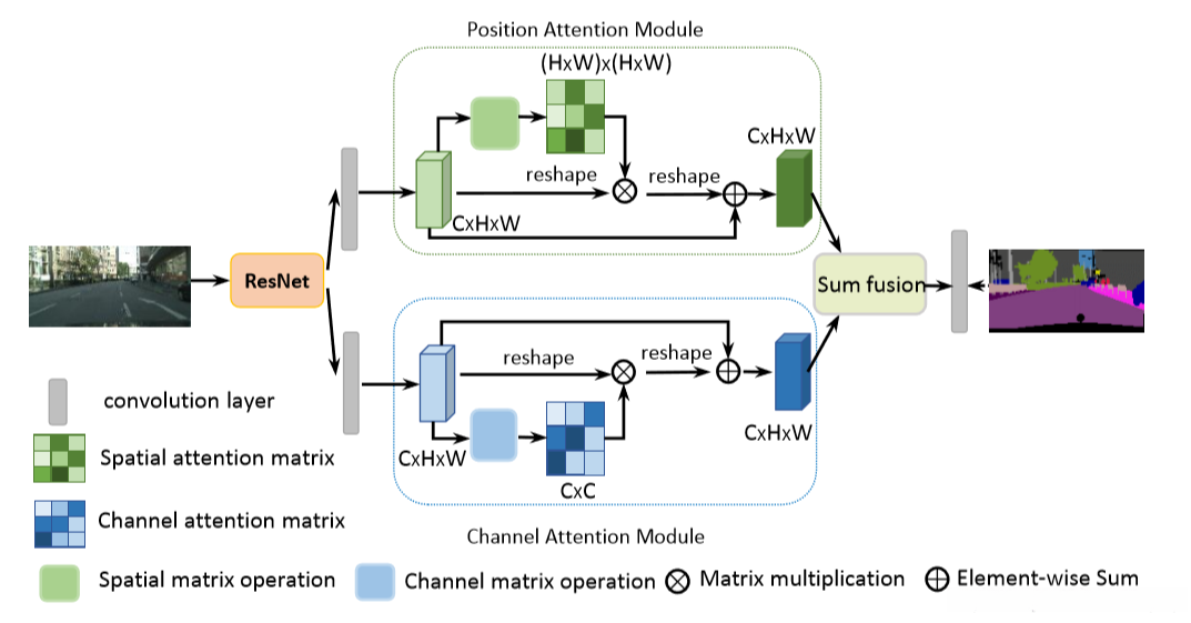- 我们在扩展的FCN之上附加了两种类型的注意模块,分别对空间维度和通道维度的语义依赖性进行建模。