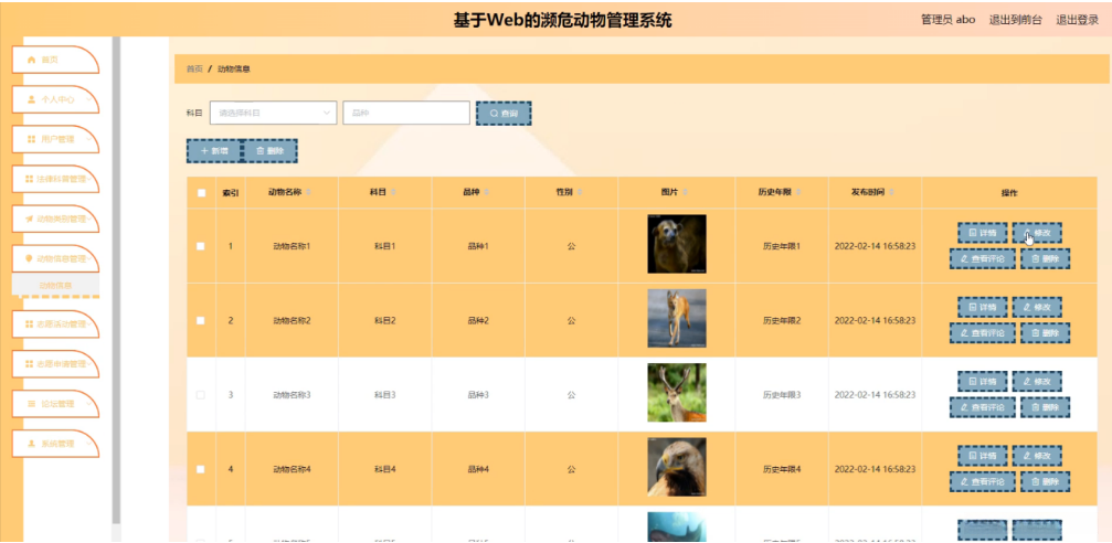管理员点击动物信息管理管理。在动物信息管理页面输入品种和选择科目进行查询、新增或删除动物信息管理列表,并根据需要对动物管理详情信息进行详情、查看评论、修改或删除操作;如图5-12所示: