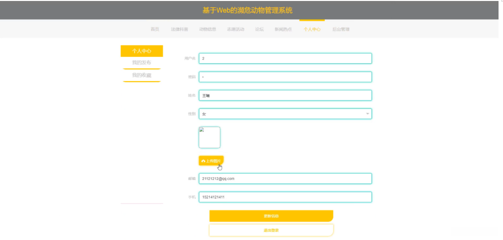 个人中心:在个人中心页面通过填写个人详细信息进行信息更新操作,还可以对我的发布、我的收藏进行相应操作;个人中心页面如图5-7所示: