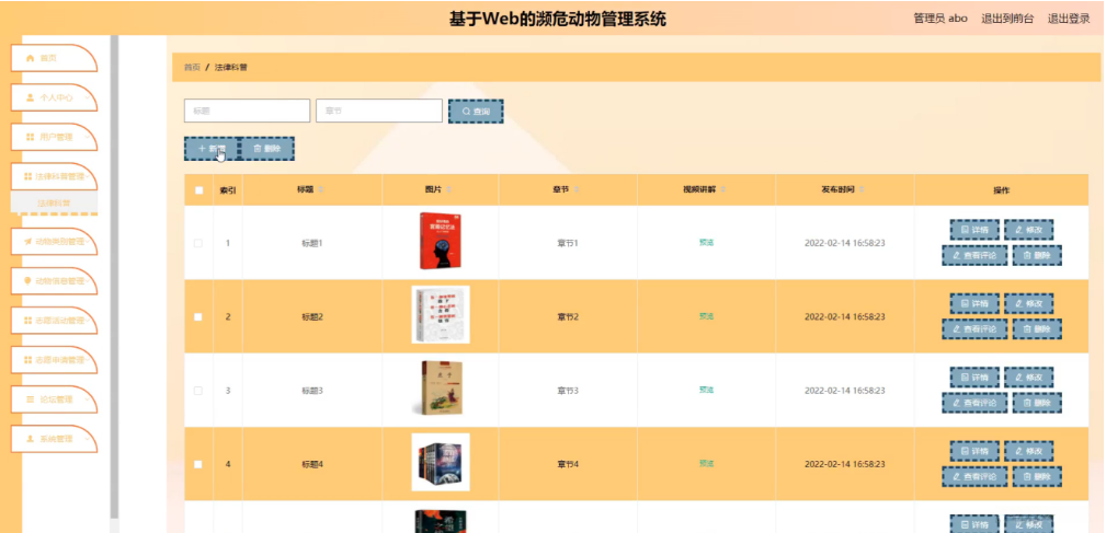 管理员点击法律科普管理。在法律科普页面输入标题和章节进行查询、新增或删除法律科普列表,并根据需要对法律科普详情信息进行详情、查看评论、修改或删除操作;如图5-11所示: