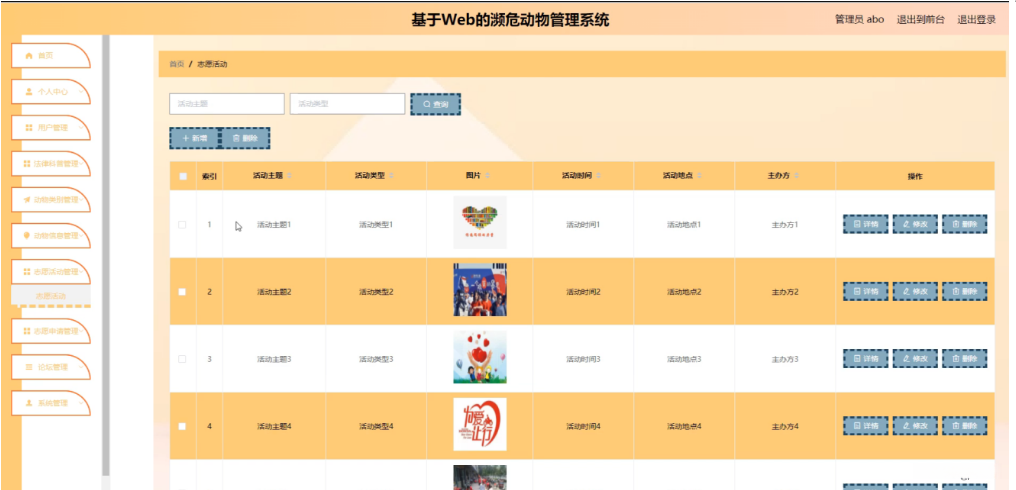 管理员点击志愿活动管理。在志愿活动页面输入活动主题和活动类型进行查询、新增或删除志愿活动列表,并根据需要对志愿活动详情信息进行详情、修改或删除操作;如图5-13所示: