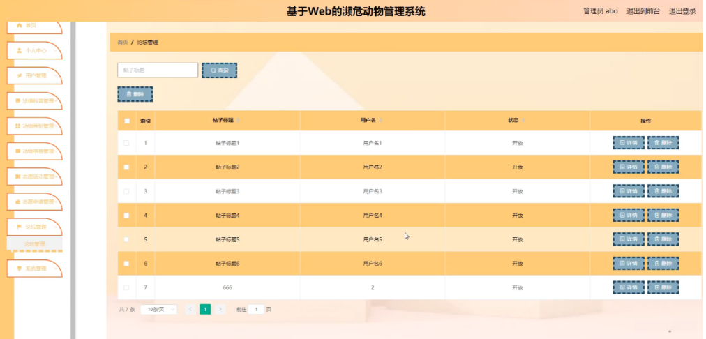 管理员点击论坛管理。在论坛页面输入帖子标题进行查询或删除论坛列表,并根据需要对论坛详情信息进行详情或删除操作;如图5-15所示: