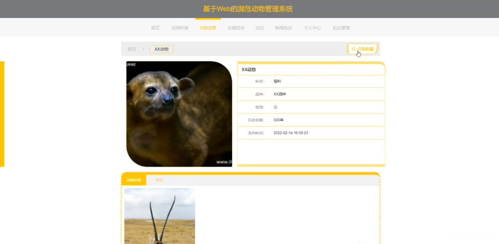 动物信息:在动物信息页面的输入栏中输入科目和品种进行搜索,可以查看到动物详细信息,并进行评论或收藏操作;动物信息页面如图5-4所示: