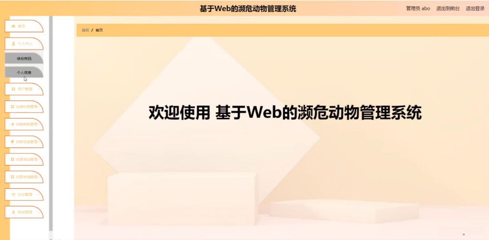 管理员进入主页面,主要功能包括对个人中心、用户管理、法律科普管理、动物类别管理、动物信息管理、志愿活动管理、志愿申请管理、论坛管理、系统管理等进行操作。管理员主页面如图5-9所示: