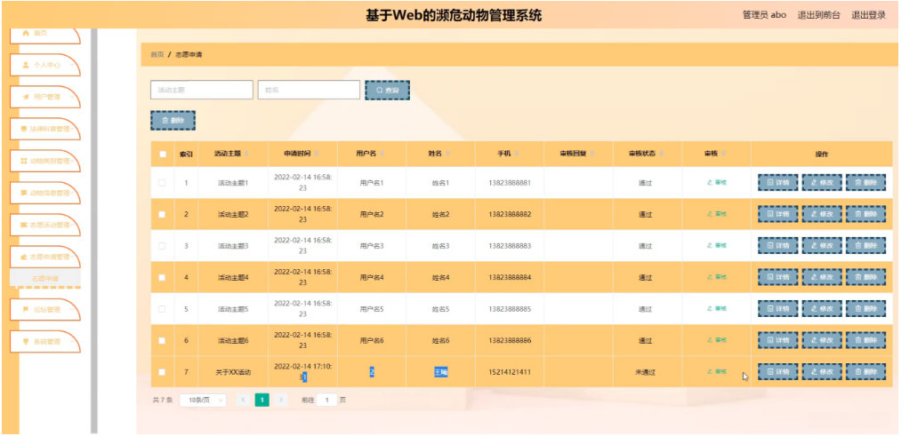管理员点击志愿申请管理。在志愿申请页面输入活动主题和姓名进行查询或删除志愿申请列表,并根据需要对志愿申请详情信息进行详情、修改或删除操作;如图5-14所示: