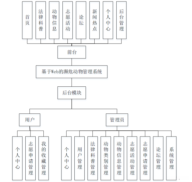 考虑到实际生活中在濒危动物管理方面的需要以及对该系统认真的分析, 将系统权限按管理员和用户这两类涉及用户划分。