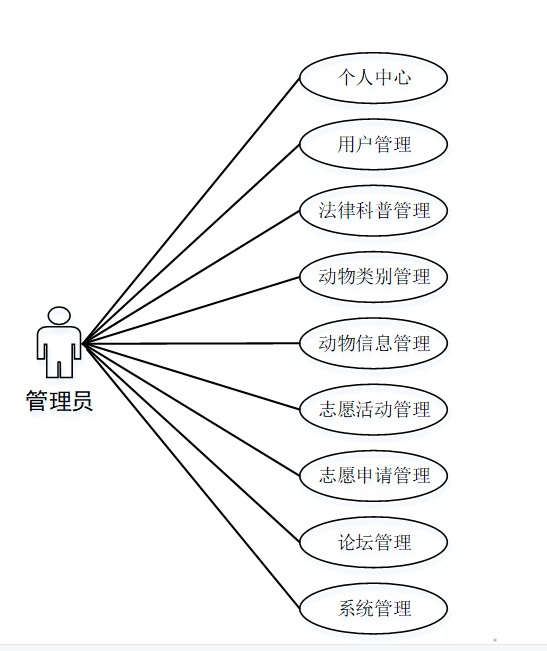 管理员登入使用本系统涉到的功能主要有个人中心、用户管理、法律科普管理、动物类别管理、动物信息管理、志愿活动管理、志愿申请管理、论坛管理、系统管理等功能。管理员用例如图3-1所示。
