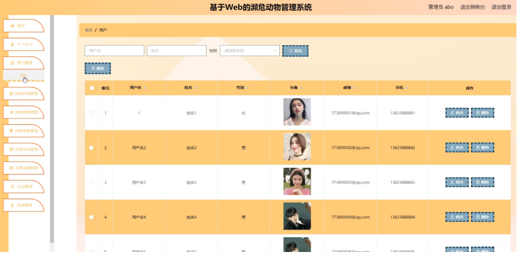 管理员点击用户管理。在用户页面输入用户名、姓名和选择性别进行查询或删除用户列表,并根据需要对用户详情信息进行修改或删除操作;如图5-10所示: