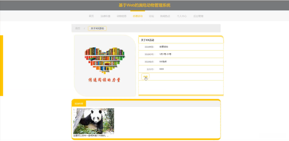 此外,基于Web的濒危动物管理系统还可以提供公众参与的机会。通过向公众开放相关数据和信息,人们可以更加了解濒危动物的重要性和面临的威胁,从而增强对濒危动物保护的意识和支持。同时,公众也可以通过该系统参与到濒危动物保护工作中,例如举报非法捕猎行为、参与志愿者活动等,共同努力保护珍稀物种的生存环境。