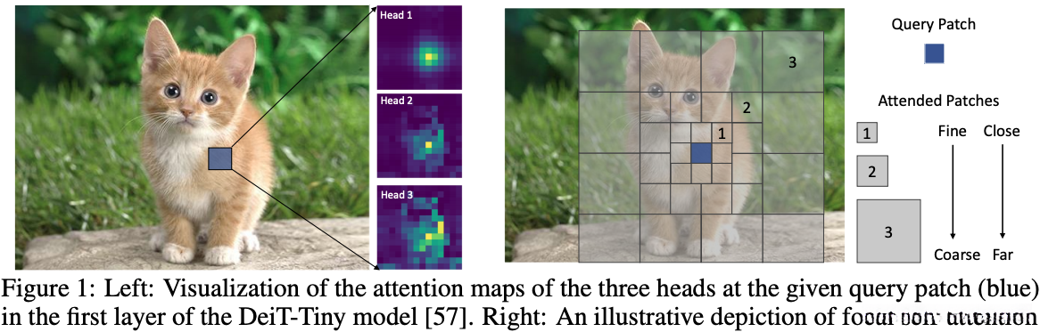 1. ViT 介绍:在 Transformers 中,自注意力是其独特于广泛使用的卷积神经网络的关键组成部分。在每个 Transformer 层,它支持不同图像区域之间的全局内容相关交互,以建模短距离和长距离依赖关系。通过可视化,作者确实观察到 Transformer 学会了同时关注局部环境和全局语境 (见图1左侧)。