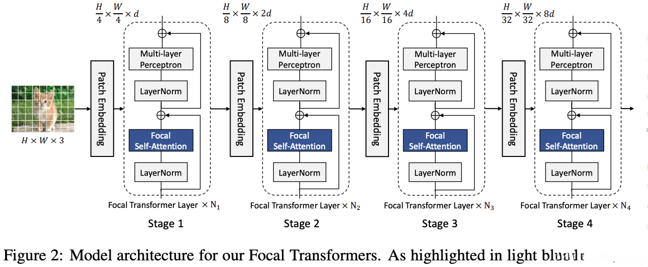 3. 给定这个空间特征映射,将其传递到 focal Transformer block 的四个阶段。在每个阶段i∈{1,2,3,4},focal Transformer block 由 Ni focal Transformer 层组成。