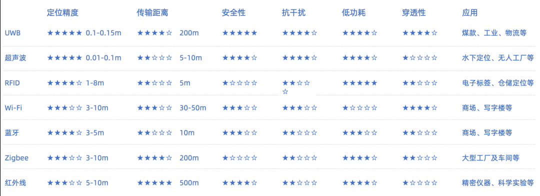 UWB技术目前遵循最新的IEEE 802.15.4a/z标准,在该标准下对微定位技术和安全通信进行了专门优化。作为一项高精度的定位技术,UWB能够实现精准的几厘米级定位,在准确度方面相比目前使用的低功耗蓝牙(BLE)和Wi-Fi方案而言高出近一个数量级以上,并展现出卓越的室内定位性能,并完美满足室内应用需求。